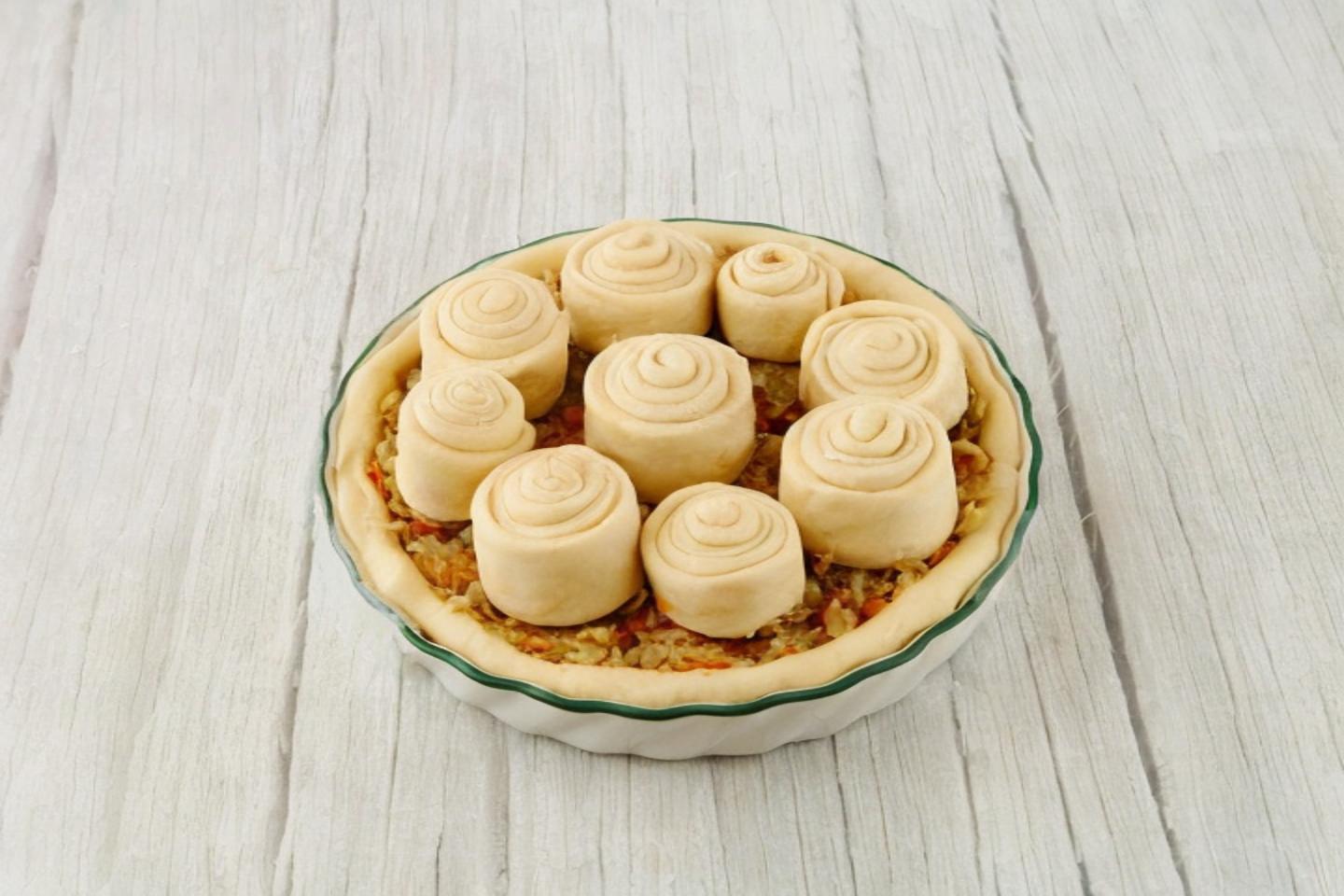 Отримані рулетики викладіть зверху начинку. Прикрийте майбутній пиріг легким рушником і залиште для вистоювання на 15-20 хвилин. Увімкніть духовку на 180 градусів.