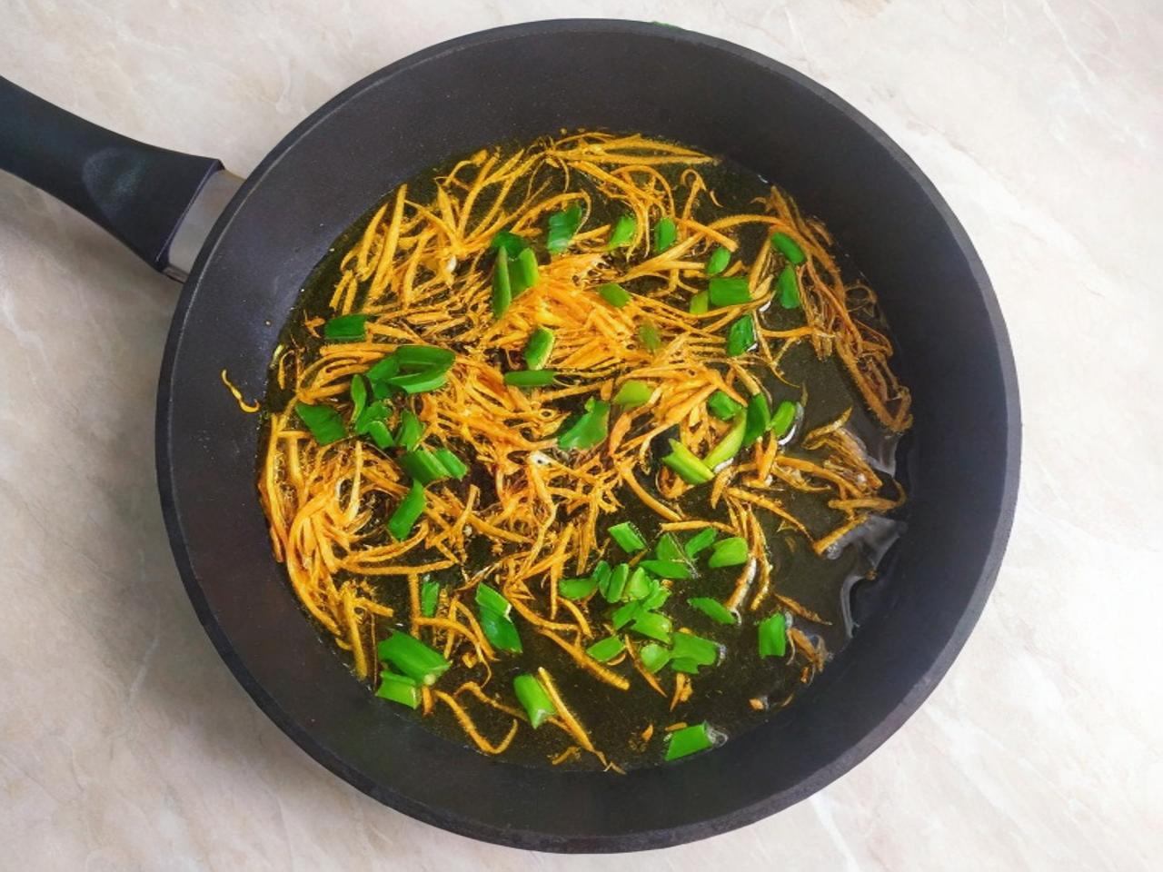 На сковороді з олією злегка обсмажте спершу моркву, а потім додайте зелену цибулю.